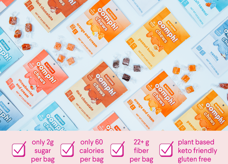 FIBER BOOSTS DIGESTION, KEEPS YOU LIGHT AND PROVIDES NONSTOP ENERGY. WITH FIBER CANDY YOU CAN STAY FULL FOR LONGER AND TURN CRAVINGS INTO CANDY-COATED VICTORIES. GIVE YOUR GUT THE LOVE IT DESERVES WITH OOMPH! FIBER-PACKED TREATS!
